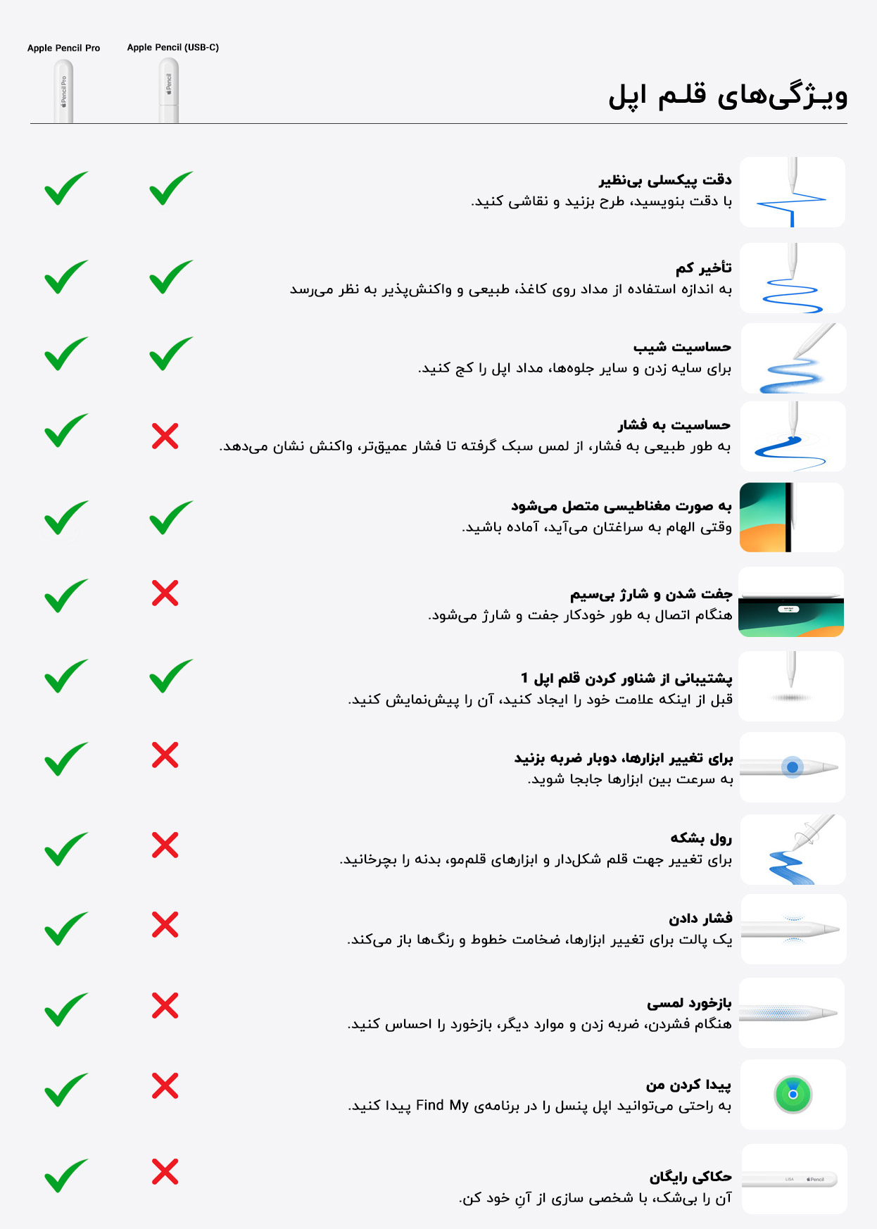 قلم 1 اپل با آیپد پرو نسل اول و دوم بصورت مستقیم و با آیپدهای نسل ششم تا دهم از طریق یک مبدل USB-C به لایتنینگ، متصل شده و سازگار است.